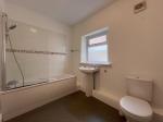 9' 9'' x 6' 6'' (2.98m x 1.99m) uPVC double glazed frosted glass window with opener to side elevation. Three-piece suite comprising of a low flush WC, pedestal hand wash basin, and a bath with mixer tap and wall mounted shower wand. Tiled three quarter height to the bath. Central heating radiator. Wall mounted extractor fan. Ceiling light point.